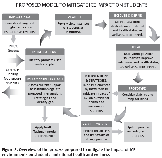 • The ideation phase focused on the transition from identifying problems to considering viable solutions for mitigating the impact of ICE environments on students. This ideation phase had already commenced during the data collection phases, where students were requested to suggest support and other solutions. Additionally, this phase entailed considering and integrating the findings regarding the pandemics impact on students' food security, dietary intake and related health and wellness indicators. Finally, the researcher constructed a wide set of viable solutions by means of brainstorming.