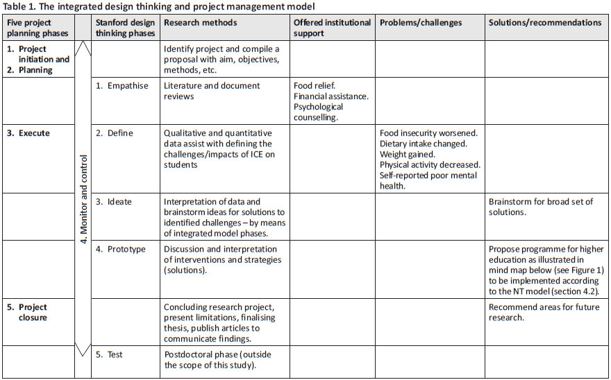 In conclusion, the findings of the overarching research study confirmed the need for higher education institutions to implement strategies and interventions to alleviate the negative impact of ICE environments, like COVID-19 circumstances, on the health and wellness of students. Design thinking and project management principles were integrated as methodology to develop strategies and interventions as a proposed programme (prototype) for higher education institutions (Figure 2).