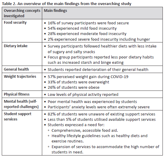The overarching research study was a concurrent, exploratory mixed methods study (Tashakkori & Teddlie, 2010) that utilised online survey and focus group discussions to examine food security and related wellness indicators of a cohort of students in central South Africa. The first section of the survey investigated food security status with the Household Food Insecurity Access Scale (Coates et al., 2007) and dietary intake with the SA Demographic and Health survey (Department of Health, Medical Research Council, OrcMacro, 2007). The second section of the survey assessed health and wellness indicators with the questionnaire to assess adherence to diet and exercise advice (Dubasi et al., 2019) and mental health by means of the self-reporting Depression, Anxiety and Stress Scale of 21 Items (Lovibond & Lovibond, 1995). It should be noted that the results on the mental health survey section were not diagnostic but rather self-reported challenges. Focus group discussion probes were aligned to encourage discussions on food security, dietary intake, health and wellness, mental health, and institutional support services during COVID-19.