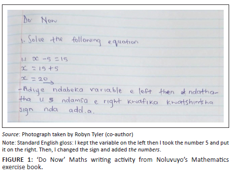 Figure 1 is a photograph of a Grade 9 learner's (Noluvuyo) Mathematics exercise book. Noluvuyo's teacher, Ms Bonde, often employs a 'do now' activity at the start of the lesson. The intention with a 'do now' is to stimulate the learners' mathematics thinking through solving a problem that uses knowledge from a previously studied topic. In this case Ms Bonde has chosen to use 'think aloud writing' where learners make their thinking visible through a verbal written explanation of the procedure they conducted to solve the problem. Ms Bonde instructed the learners to use any language resources they liked to write their explanation. In this way she constructs an established TL space in the classroom. Noluvuyo has correctly solved for x and explains her procedure verbally using TL. In the spoken-like register that Noluvuyo uses to get this learning task done, she employs discipline-specific words in English (e.g. 'variable', 'sign' and 'add') and verbs describing her mental procedure in isiXhosa ('ndabeka', 'ndamsa', 'ndathatha'). In so doing, Noluvuyo eases the mental load involved in the task by using a meshed register with which she is familiar in the oral mode and transfers this into writing to complete the task quickly. Translingualism here supports the 'register-meshing' (Tyler 2016) Noluvuyo uses to bring together the scientific register of mathematics in English with more informal description using resources of isiXhosa. Noluvuyo's languaging resonates with Makalela's description of ubuntu TL where one 'language' is incomplete without the other. While Noluvuyo writes using fluid languaging, what can be described as first-order language conceptions (Lemke & Lin 2022), Ms Bonde's instruction to write their explanation in any language nevertheless draws on the second-order conception of language as named object.