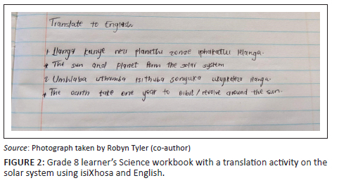 Figure 2 shows a learner's unedited science writing activity which is different to the writing activity represented in Figure 1. While Figure 1 contains evidence of exploratory writing in an everyday register employing features of English and isiXhosa in a meshed way, the writing in Figure 2 was created in response to a translation activity in which languages were kept separate, and is more presentational or formal (Barnes 1992). The teacher first asked the learners to co-construct sentences in isiXhosa about the solar system from the knowledge they had gained through reading notes and engaging in class discussion. Then they were instructed to work individually to provide the English translation of each sentence, thereby generating bilingual notes for themselves. Importantly, the task was set up in a way that privileged the science writing in isiXhosa as it appears in the initial position ahead of English. This was the first time this class engaged in writing bilingual science notes. While the learners need to draw on their bilingual resources to complete the task, it is informed by a second-order conception of language.
