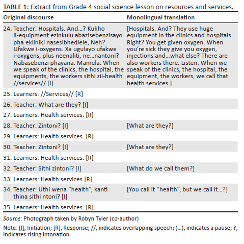 The very brief extract from a transcript of classroom talk in an official English LOLT Grade 4 Social Sciences lesson shown in Table 1 is illustrative of the interaction throughout the longer plenary session. This followed a tight initiation and response pattern with initiations from the teacher signalled by rising intonation, and short one- or two-word responses from the learners in chorus. The teacher is TL using the resources of isiXhosa and English and in turn 24 is making use of familiar language to explain the new concept of health services. However, the children's talk is limited to short one- or two-word responses mostly in monolingual English. The children are not given opportunities to explain or elaborate on their answers using their own full linguistic repertoire. It seems that the goal of this interaction is for the children to learn, through repetition, to produce the English term 'Health services' an example of presentational talk (Barnes 1992). The potential of TL here is curtailed by the fact that it is limited to the teacher's oral discourse, not giving learners opportunities to work on their own understanding (Barnes 1992) through either exploratory talk or writing using their full linguistic repertoire. This does not mean that the teacher's translanguaged explanation and initiation in turn 24 is not helpful for learners, nor that they should be speaking monolingually in English. Rather, we draw attention to the fact that (trans)languaging-for-learning requires more intentional design and active engagement and participation from the learners in talk and writing. In this case a teacher is doing what they can to develop learners' understanding in a system where code-switching is seen as illegitimate, thus working in what we have described earlier, following García and Li (2014), as an 'adaptive TL space'. Legitimising the teacher's oral TL is an important first step in enabling teachers to build from these languaging practices to use TL for learning.