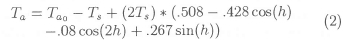 where the daily temperature varies by ±TS about the daily average (taken here as ±7°) and h represents the hour angle.
