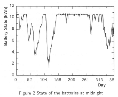 when insufficient energy is available from the system, although this can be mitigated by a load shedding strategy to ensure that essential needs are met. The approach examined here of monitoring the status of the storage and beginning to shed load when around half a day's energy remains would not, however, appear to allow much more than a 15% reduction in the number of panels.