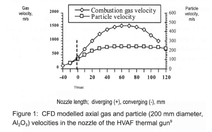 A recently proposed method for thermal spraying of Zn-Al wire utilises the high velocity air flame (HVAF) process, reported elsewhere by the author8. In the HVAF thermal gun, wire is melted in the combustion zone (2000 K) and accelerated by supersonic flow in the converging-diverging De Laval nozzle. The high efficiency of the HVAF thermal spraying process can be attributed to the method of injecting the spray material in the high velocity flow. Spray wire enters the combustion zone in such a way that it melts before entering the nozzle and, therefore, molten material gains the most velocity as it is carried in the flow through the highest acceleration zone of the nozzle, which is within approximately the first 50 mm after the nozzle throat as shown in the graph (figure 1), reported in prior work by the author9. According to computational fluid dynamics (CFD) modelling, the gas flow reaches approximately 1600 m/s at 70 mm from the nozzle throat and then it decelerates; however, particles reach the highest velocity approximately 50 mm from the nozzle exit, which corresponds with the results reported by Modi10 and Kwon11. The gain in particle velocity is dependent on the particle size, mass and the loading factor of the multiphase flow. Another example of the efficiency of the thermal spraying process where spraying material is injected before the nozzle is the Cold Spray process, where the powder is injected axially in the flow, and particles reach velocities up to 1200 m/s.