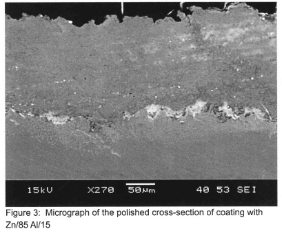 The most common thermal sprayed materials are zinc, aluminium and their alloys. Zn-Al alloys have an excellent corrosion behaviour in combining the special advantages and characteristics of pure zinc and aluminium, reported by He2. While zinc in the spraying layer takes care for the active corrosion protection of steel, aluminium provides the passive protection against corrosive industrial or maritime atmosphere. Zn-Al coatings have the advantage of better mechanical characteristics compared with pure zinc coatings. Salt spray tests under simulated maritime atmosphere show that Zn-Al coatings provide better protection against corrosion than layers with pure zinc or aluminium. In addition, layers made with Zn-Al coatings showed excellent corrosion protection resistance in an S02 industrial atmosphere.