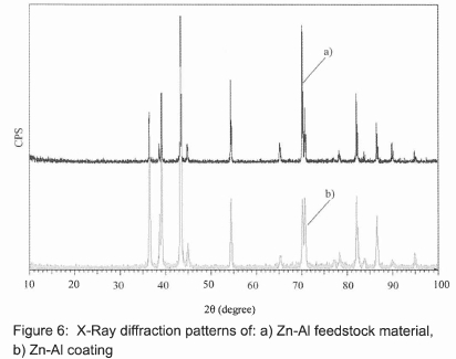 To determine the crystallography of phases present in the coatings, X-ray diffraction (XRD) was carried out on a Bruker AXS X-ray diffractometer D8 with CuKα radiation operating at 40 KV and 20 mA. The results of XRD analyses of the feedstock material and the Zn-AI coating presented in figure 6 shows no phase changes indicating that the crystallinity of Zn-AI does not change in the thermal spraying process.