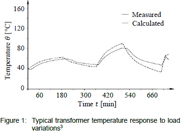 The temperature response of a transformer to varying load current can be represented with rising and falling exponential functions. As such, the exponential time constant analogy is derived by applying heat transfer principles in conjunction with exponential curve fitting methods6. This 'fitting' of the solution curve to represent the temperature response is depicted in figure 1 for a typical load cycle.