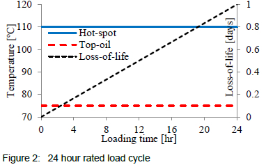 To illustrate transformer loss-of-life, figure 2 was plotted using the equations covered in section 3. Note that at rated load the hot-spot temperature corresponds to the value in equation 7. Also, note that for a 24 hour rated load profile the temperature response remains flat and the loss-of-life amounts to one day as per the definition in International Electrotechnical Commission (lEC) 60076-7:20053.