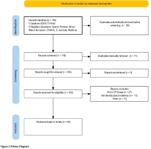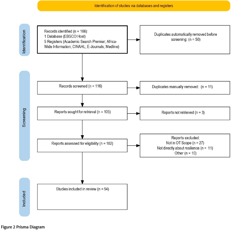 Step 1: The process commenced with a search conducted on 15th June 2021 using the EBSCO Host platform with Academic Search Premier, Africa-Wide Information, CINAHLand MEDLINE and E-Journals activated. The search strings used were 'resilience or resiliency or resilient' (In Title) AND 'occupational therapy or occupational therapist or occupational therapists' (All Fields). The search yielded 177 sources that were exported into Rayyan3.