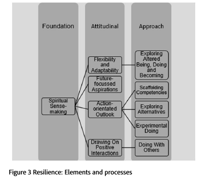 Categories were inductively formed to provide an integrated perspective of the inherent elements and processes of resilience, emerged from the analysis; these are shown in Figure 3 (below). The category, 'spiritual sense-making' seemed to serve as a foundation for four attitudinal categories, namely 'flexibility and adaptability', 'future-focused aspirations', 'action-oriented outlook', and 'drawing on positive interactions'. Approaches used were 'exploring altered being, doing and becoming', 'scaffolding competencies', 'exploring alternatives' and 'experimental doing'.
