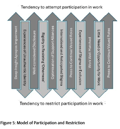 The factors that bolstered resilience seemed to resonate strongly with categories that emerged from research undertaken to explore the influences that shape participation of persons with psychiatric disability in the work. The Model of Participation or Restriction, depicted in Figure 5 (adjacent), was developed to depict these influences and demonstrate how these shape propensities to participate in work or restrict such participation.