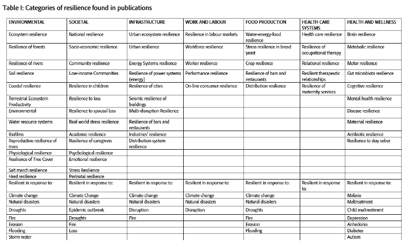 A search was conducted on Scopus, chosen for its multi-professional focus and reputation for quality, peer-reviewed research. The search, last updated in April 2024, undertaken with no filters and using the term resilience in 'all fields' yielded 846 856 hits. In order to identify publications that focused specifically on resilience, rather than those in which resilience is mentioned, the search was repeated to identify only sources in which the term resilience appeared in the title; it yielded 60 522 hits. The numbers of publication tell a story, but I was also interested in the breadth of focus the field. Focusing only on the titles of research on resilience, I used a Google Jamboard to develop categories that captured the types of resilience and the factors that required such resilience. Categories were developed until no new categories were developed for 20 consecutive articles; these are shown in Table I (page 3) which illustrates the breadth of interest in resilience across diverse fields, systems and structures.