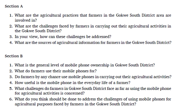 Data was mainly collected from smallholder farmers, while agricultural extension service staff and other vital informants in the value chain were also chosen as relevant populations. All 16 interviewees were smallholder farmers and the focus group participants included small-holder farmers, agricultural extension officers and other key stakeholders in the agriculture value chain. Participants were purposefully chosen to meet a variety of variables like their age, gender, level of education, family size, and farming experience to ensure a representative sample. Focus groups allow participants to build on each other's ideas. They can lead to more discussion than individual interviews since they allow for greater closeness and depth of information (Krueger & Casey, 2014). Participants may feel more at ease in a focus group. Still, it may be preferable to conduct individual interviews if the subject matter is sensitive (such as poverty or a lack of understanding of mobile phone use). Focus groups and interviews produce data with the same level of detail. This research used 16 interviews and one focus group to complement one another and ensure that multiple data sets were gathered. The focus group discussion was necessary to validate and amend the data obtained from the 16 individual interviews, thus leading to data saturation.