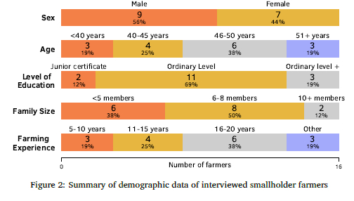 Of the 16 research participants chosen for the interview, nine were male, and the other seven were female, making 56.3% male and 43.7% female participants. Participants were between the ages of 38 and 54 at the time of the empirical fieldwork. The first author interviewed farmers with agricultural experience ranging from ten to more than 20 years at farmers' markets. Farmers in this study had a high degree of basic literacy as they had all completed at least an ordinary level of education schooling. Most children go through two years of early childhood learning after age four. They enrol in primary education for seven years at age six, culminating in a Grade 7 Certificate. At 13, the learners enrol in secondary education, which lasts six years and consists of lower and upper secondary education. The lower secondary educational level is the Ordinary (O) level, taking a four-year cycle (from Form 1 to Form 4), which leads to the awarding of the 'O' Level Certificate of which one is required to have attained an A, B or C symbol in at least five subjects including English language and Mathematics for one to be awarded a complete 'O' level certificate.