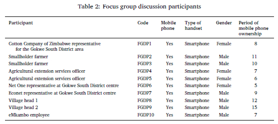 The interview participants were given code identities as Smallholder Farmer Number SHF [1-16] for anonymity purposes (Saunders et al., 2015). The 16 interviewees were rich cases; hence, they became critical informants as they possessed vital traits that the researchers desired for this study (Dworkin, 2012). Our sample number falls within the range of sample populations (15 to 25) in line with Marshall et al. (2013), Sandelowski (1995), and Vasileiou et al. (2018) and has been used by most previous researchers; see Kirsten and Van Zyl (1998), Nkomoki et al. (2019), and Van Zyl et al. (2014). The focus group discussion participants were given code identities as Focus Group Discussion Participant Number FGDP[1-10] for anonymity purposes. The details of participants to the FGD are shown in Table 2, summarising their life responsibilities, gender and the number of years that each has owned a mobile phone.