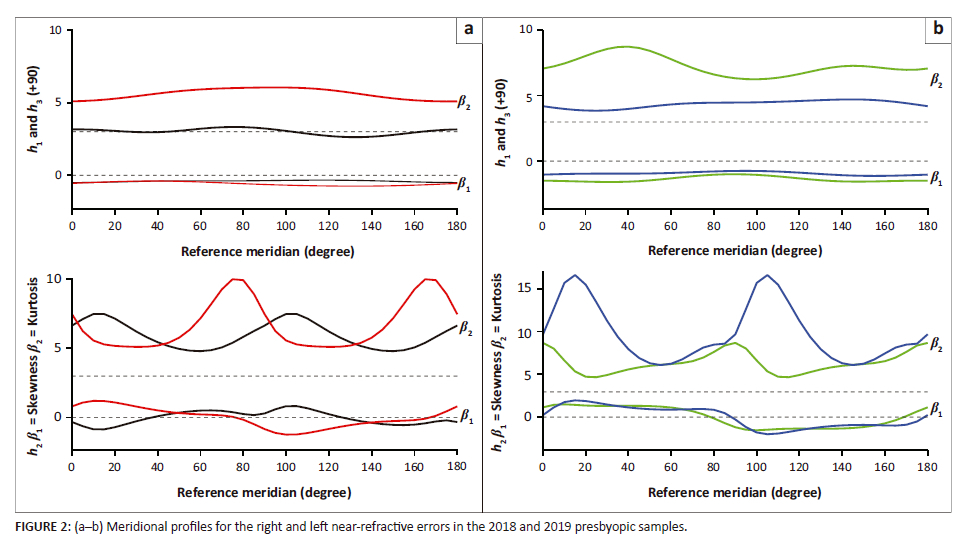 The normality of refractive error distributions is assessed using meridional or polar profiles with univariate Mardia's skewness (β1) and kurtosis (β2). The expected skewness (β1) should be zero for a symmetric or normal data distribution. However, computed values above or below zero are considered positively and negatively skewed, respectively.16,19,21,22,23 The expected value of kurtosis (β2) should be three for mesokurtic distributions of near-refractive errors, with values below or above three considered platykurtic or leptokurtic.16,19,21,24