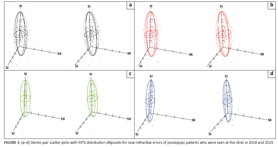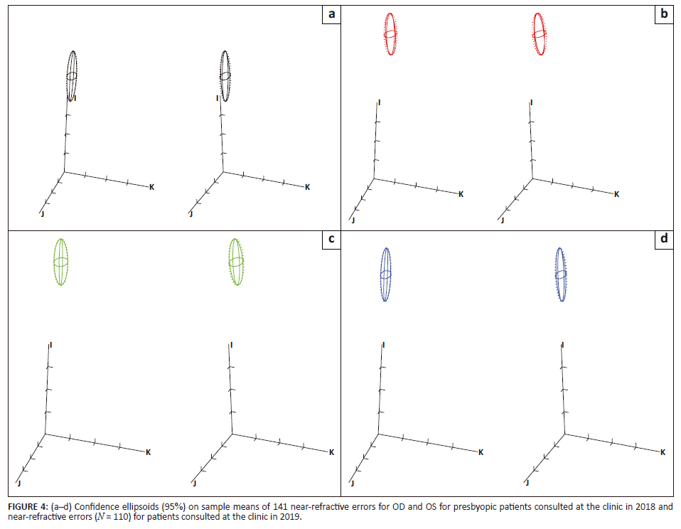 Figure 4 presents stereo-pair plots with 95% confidence ellipsoids (CE) on the mean near-refractive errors for OD and OS of presbyopic patients consulted at the clinic in 2018 and 2019. The 2018 sample includes 141 near-refractive errors, while the 2019 sample includes 110. The centroids of the CE and sample means shifted above the origin because of the proximal additions.