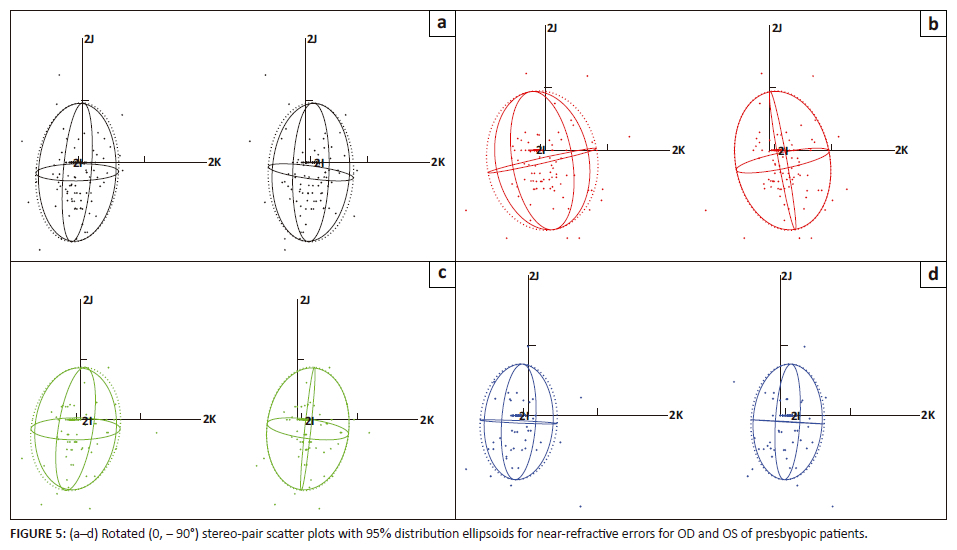 The near- or proximal refractive errors for presbyopic patients are usually recorded with near additions. Clinical notations of the sphere (Fs), cylinder (Fc), and the corresponding axis (A) of the cylinder and the near addition (Fadd) must be transformed into dioptric power matrices or vectors for effective scientific analysis using Matlab software.9,10,11,12,13,14,15,16 This allows the sphero-cylinders to be statistically analysed as one entity for univariate or multivariate methods to be used with near-refractive errors and quantitative information (with statistical measures) such as the means, standard deviations or variances to become measurable. The article published by Harris16 shows a proper representation of near-refractive errors, including three-dimensional (3D) surfaces of constant probability density with stereo-pairs scatter plots in 3D Euclidean symmetric dioptric power spaces. Other quantitative analyses of near-refractive errors for presbyopic patients in two-dimensional spaces include meridional profiles of dioptric power and other methods that will be used herein.16 Using these methods, the distributions of near-refractive errors for the right (OS) and left (OS) eyes can be more easily investigated, properly analysed and better understood.14,16,17,18,19