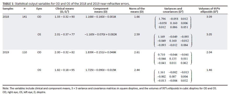 Table 1 shows the statistical output variables of the near-refractive errors for OD and OS of presbyopic patients consulted at the clinic in the 2018 and 2019 samples. Statistics related to near-refractive errors for OD and OS herein are presented in the form of the clinical and component means, norms of the means, variances and covariances, and volumes of 95% ellipsoids.