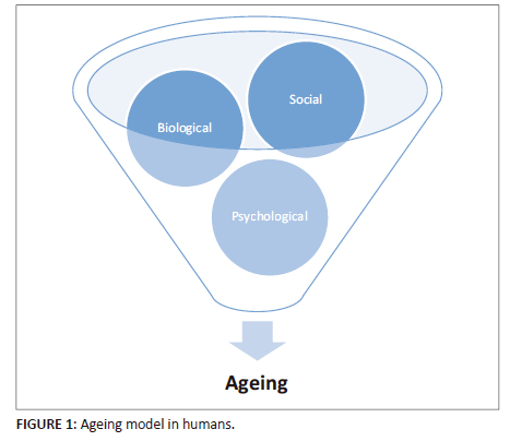Ageing is a complex mechanism in humans that manifests on a biological, psychological and social level (Figure 1). The WHO defines biological ageing in humans as the impact of a wide variety of cellular and molecular changes that occur over time. These changes contribute to cells becoming less efficient, losing their ability to divide and repair themselves and are referred to as cellular senescence. In healthy individuals, senescent cells can self-destruct by a process of apoptosis or are removed by the immune system to maintain homeostasis. As the age of an individual increases, these homeostatic regulators lose their functional ability, which leads to the accumulation of senescent cells in tissue and organs. The build-up of senescent cells leads to decline in physiological function and age-related NCDs. The rate at which biological ageing occurs is dependent on a combination of extrinsic (smoking, unhealthy diet, pollution) and intrinsic (genetically predetermined) factors (Koopman et al. 2015). Psychological ageing often entails neurobiological changes, such as reduced white matter integrity and cerebral blood flow, which can impair memory, learning and emotional responsiveness (Schaie & Willis 2010). Social ageing refers to the changes in the relationship an individual has with family, friends and people in an organisation they involved in (work, prayer group), as their chronological age increases. These changes are often interlinked and the rate of the cumulative effect and the stage that they occur in an individual's lifespan differs.