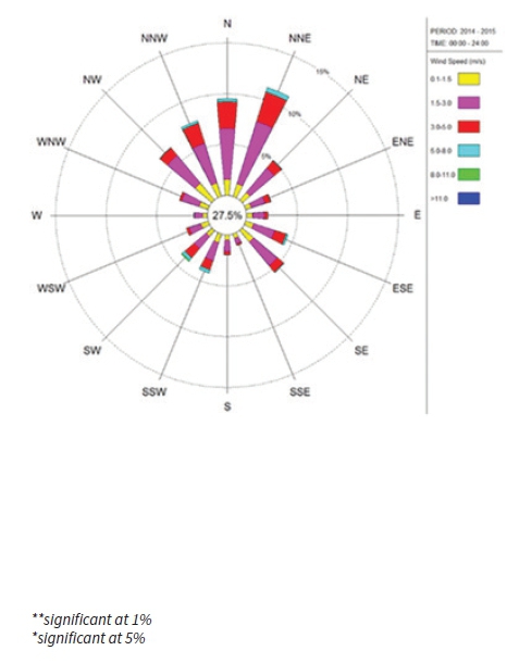 The Pearson's correlation coefficient test was done to test the relationship between dust fallout rate and meteorological parameters as well as across locations. Moderate, positive correlation with a value of 0.588 exist between average dust fallout rate and wind speed. During different seasons, the predominant winds come from different wind regimes. However, the dominant winds in the area come from the north and northwest directions as shown on the wind rose in Appendix C (two years average for 2014 - 2015) with wind speeds of 1.5 - 3.0 m/s. According to the weather data from South African Weather Service higher wind speed in the areas seldom reach > 8.0 m/s but the range 5.0 - 8.0 m/s are sometimes recorded.