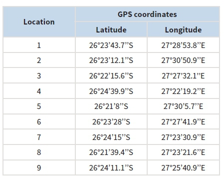 The climate in the highveld consists of short cold winters from June to August and long hot summers usually from October to March. The rainfall occurs mostly in summer ranging from 600 - 732 mm per annum. The period October-March is often characterised by heavy storms and the average annual temperature is 16 oC (Tutu et al. 2003). The sampling locations are shown in Figure 1. The coordinates of the sampling locations shown in Appendix A were recorded with a Global Positioning System (GPS) receiver. Ethical clearance was granted by the North-West University. Permission to access the mining area and communities was sought from the mine and granted.