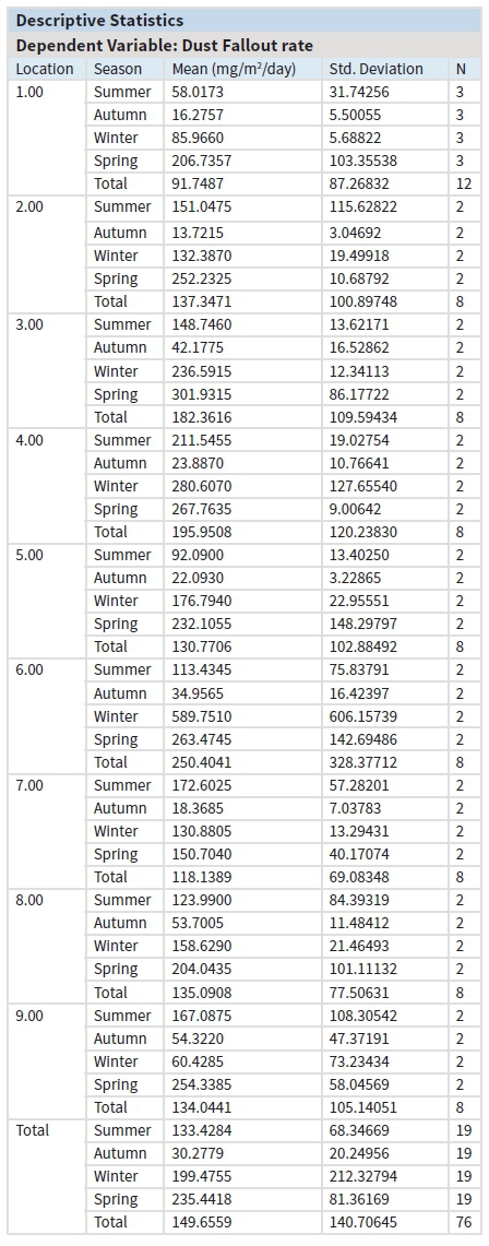Results for the ANOVA test (Appendix B) for significant difference across locations and seasons indicate that the mean dust fallout rate is significantly different across the seasons (p-value < 0.05). Dust fallout rate does not differ significantly across the locations. The mean dust fallout rate differs significantly in summer and autumn (p-values <0.05) as shown in Table 1.