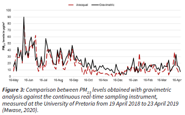 The choice of sampling equipment was determined by accessibility and cost-effectiveness c ompared toc ontinuous real-time sampling instruments. A study from Pretoria indicated a good correlation between PM2.5 sampling results obtained with the GilAir5 pump and continuous real-time sampling instruments (Spearman rank-ordered correlation coefficient 0.740; p<0.0001) (Figure 3 and Supplementary figure 1 (Mwase, 2020).