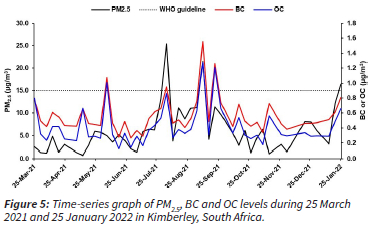 The mean PM2.5 level recorded at the study site was 6.3 µg/m3 surpassingtheyearly WHO guideline of 5 µg/m3. Additionally, on three out of the 46 sampling days, the daily WHO guideline of 15 µg/m3 was exceeded. Given that the PM2.5 soot, BC and OC levels were observed at an urban background study site, it is essential to recognise that if these concentrations are representative of the broader citywide conditions in Kimberley, they could pose a significant risk to human health. The exceeded WHO guidelines emphasise the need for an updated AQMP for the Frances Baard District Municipality that will include PM2.5, which was excluded in the current 2010 AQMP.