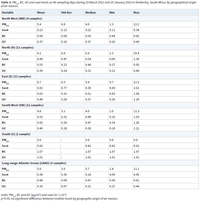 RESULTS: 24-hour PM2.5 filter samples were collected manually every sixth day from 25 March 2021 to 25 January 2022 in Kimberley, Northern Cape Province, South Africa. The mean PM2.5 concentration recorded in Kimberley was 6.3 µg/m3 (range: 0.7 - 25 µg/m3), slightly exceeding the World Health Organization (WHO) annual air quality guideline of 5 µg/m3 Additionally, the daily WHO guideline of 15 µg/m3 was exceeded on three occasions during the sampling period. The average soot (absorption coefficient), black carbon and organic carbon levels were 0.46 m-1 x 10-5, 0.6 µg/m3 and 0.4 µg/m3 respectively. Six geographic origins of air masses were identified after clustering 4476 generated 72-hour backward trajectories: North West (NW), North (N), East (E), South West (SW), South (S) and Long-range Indian Ocean (LRIO), suggesting diverse long-range transported air pollution from distant source areas