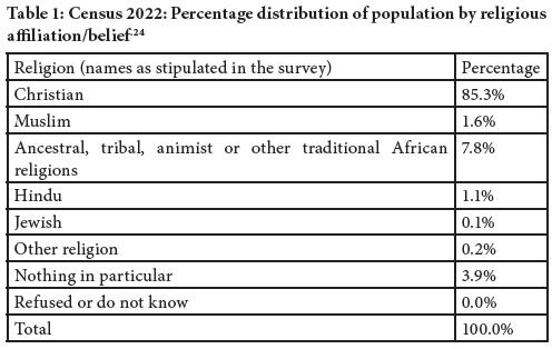 South Africa, like numerous other African countries, retains strong religious adherence. According to the latest census data from 2022, 85.3% of South Africans self-identify as Christian, marking a 2% rise from the 2015 survey and a 7% increase from the 2001 census.23
