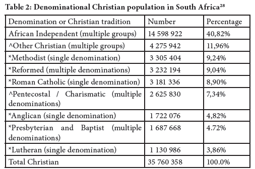 28 J Hendriks and Johannes Erasmus, "Religion in South Africa: 2001 Population Census Data." Journal of Theology for Southern Africa 121 (2005):88-111; Willem J. Schoeman, "South African Religious Demography: The 2013 General Household Survey." HTS Teologiese Studies / Theological Studies, 73(2):1-7. (February 16, 2017). [Online]. Available: https://doi.org/10.4102/hts.v73i2.3837.
