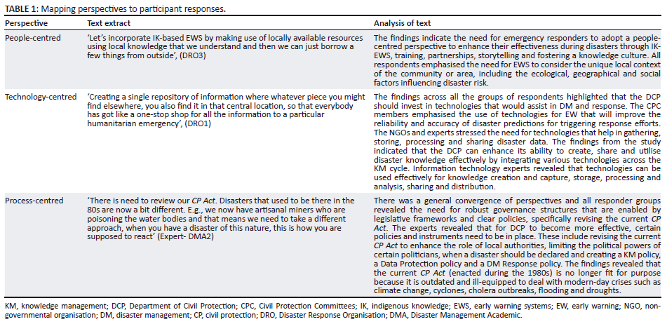 This perspective emphasises creating efficient and structured processes for capturing, organising and sharing knowledge within an organisation. Operations management, business management and organisational management are the main disciplines from which knowledge of process-centred implementation is drawn. Priority is given to creating a seamless information flow across the organisation.29 Emphasis is placed on standardised workflows and procedures for KM. This involves developing documentation systems, standard operating systems, continuous improvement frameworks, knowledge audits, cross-functional process teams, lessons learned systems, workflow automation tools, feedback and evaluation mechanisms, integrated KM and training and development on processes, among others. The process-centred perspective supports better monitoring and tracking of knowledge-related processes, facilitates quick access to relevant information and enhances consistency in KM but overlooks the social and human aspects of KS. The standardisation can also lead to rigid structures that may not accommodate creativity and flexibility. It also requires continuous updates to accommodate changing needs. However, flexibility and versatility are essential elements in DM because of the unpredictable nature of disasters, which vary in scale, type and impact. Knowledge management processes must be adaptable to quickly accommodate changes and effectively respond to unforeseen circumstances. This adaptability is crucial for integrating diverse knowledge from multiple stakeholders and promoting cross-disciplinary collaboration. Additionally, real-time information sharing is vital, requiring agile processes that can handle rapid data influxes and ensure accessibility.