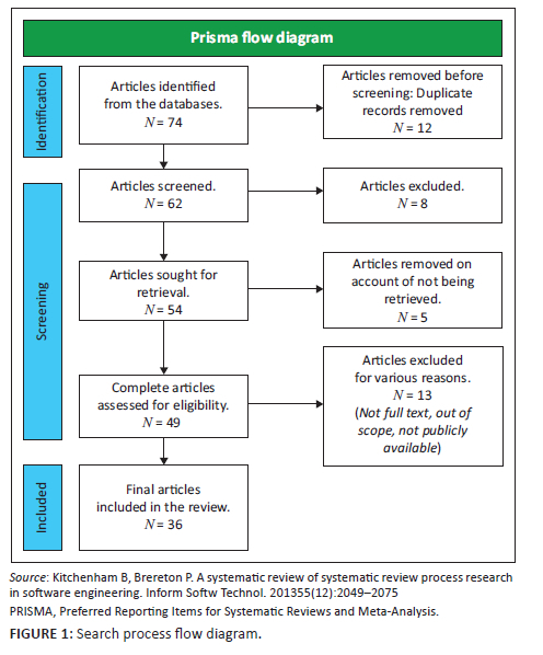 This study sought to understand the importance of SD CoPs from an organisational perspective. To assess this significance, Google Scholar, Science Direct, Web of Science and Elsevier databases were employed to assemble and integrate research published using the Preferred Reporting Items for Systematic Reviews and Meta-Analysis (PRISMA) principles. Academic databases offer a comprehensive coverage and access to scholarly work, which is of high quality.20 Some of the keywords used in the search criteria included 'Software Development', 'Communities of Practice', 'Software Developer' 'projects' and 'knowledge sharing'. The logical operators such as the 'AND' and 'OR' were applied to create effective queries. The general SLR process is illustrated in Figure 1: