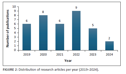 After the screening and selection process, a total of 36 articles were considered for further analysis. To maintain relevance, the bar graph below shows the distribution of the selected articles per year, from 2019 to 2024. A bar graph is simply a visual representation of data with bars of varying lengths used to show the frequency, and distribution of different categories. As stated earlier on in the inclusion criteria, different research approaches were used in all these articles (Figure 2).