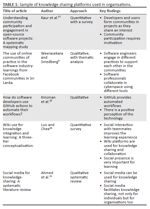 Multiple platforms are adopted for knowledge sharing in CoPs.21 From a software development perspective, these important tools and platforms facilitate effective communication among software developers. According to Jadhav et al.,22 version control systems are used for knowledge-sharing in software development teams. Basically, some of the knowledge sharing platforms include social media, online platforms and Knowledge Management Systems (KMS). However, in the SD CoPs, specific tools such as version control systems, code repositories and code review tools are used for effective knowledge sharing.22 Wiki platforms are tools used for project communication and collaboration within the software development teams.23 These software tools allow software developers to create, edit, and organise content collaboratively. Wiki platforms serve as knowledge repositories where software development teams can document their project requirements,24 coding standards and the associated best practices.