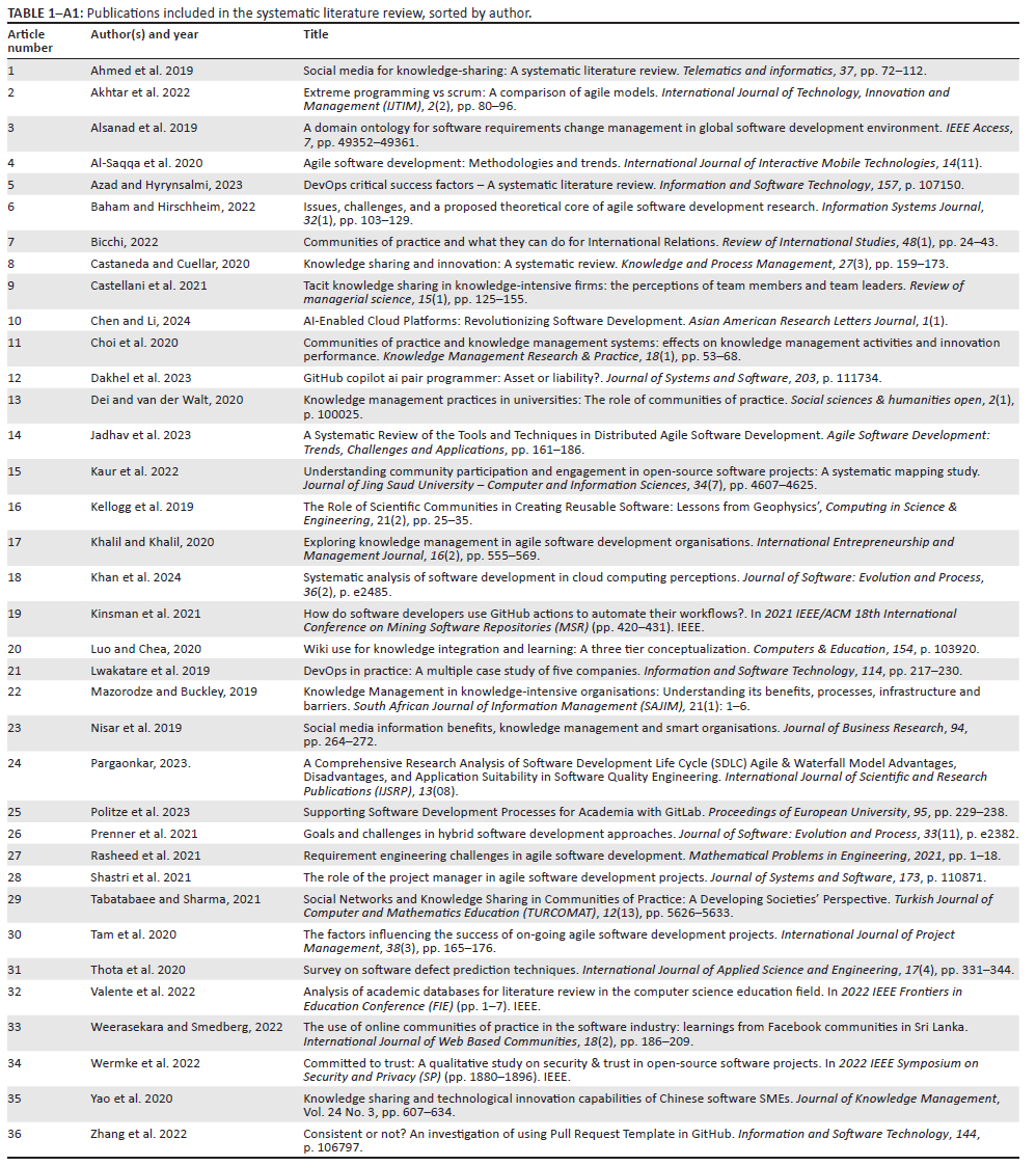 Multiple themes emerged from these articles, but this study was focused on understanding CoPs, specifically for knowledge sharing in software development. In the realm of software development, new tools, frameworks and methodologies are continuously evolving, hence the need to understand these in detail. Frameworks support software developers by offering pre-existing solutions to typical challenges, reducing the necessity for extensive reworking. Thus, the use of frameworks facilitates effective software application development. Appendix 1 shows all the publications included in this SLR.
