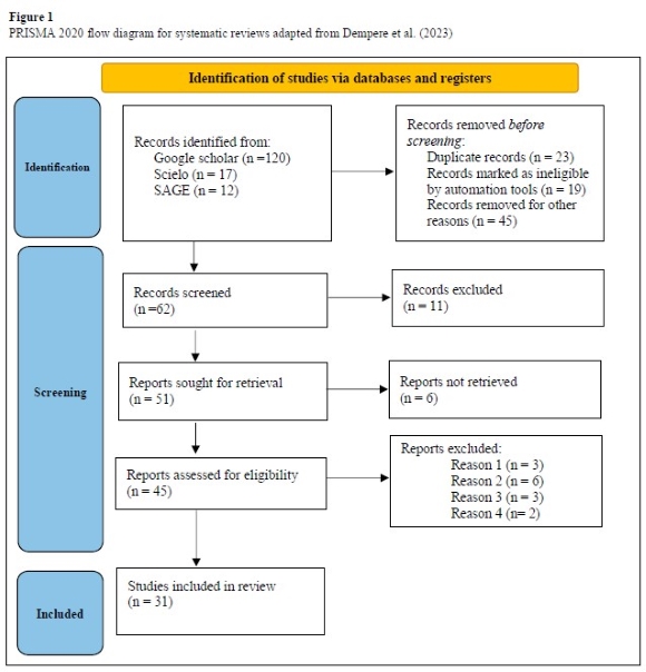 In this systematic review, we developed a search strategy to identify relevant literature relating to students' use of ChatGPT in higher education. The search strategy followed in this study included the use of keywords such as ChatGPT, Artificial Intelligence, Students, South Africa, and higher education. We inserted our search string as follows in all these databases [(ChatGPT OR Artificial Intelligence OR Students OR South Africa) AND (higher education)]. We searched two databases including SAGE Journals and SciELo as well as the search engine Google Scholar to retrieve data for the study. The initial search conducted from March 2023 to January 2024 without data parameters resulted in 120 articles retrieved from Google Scholar alone. However, we excluded a total of 41 documents consisting of non-peer-reviewed literature from the initial search. Hence, 79 peer-reviewed academic journal articles emerged from our search strategy. First, we narrowed down our data parameters to encompass literature published between 2022 and 2024, resulting in 49 journal articles. We then filtered out articles not written in English, reducing the count to 31. Subsequently, we conducted a search to identify and eliminate duplicate articles sourced from various websites, further reducing the tally to 23. Finally, we screened the titles and abstracts of the remaining articles meticulously and selected only 15 from those retrieved via Google Scholar. Following a similar methodology, we applied our search criteria to the two databases. From the SAGE Journals database, we identified 9 relevant articles and from SciELo, we found seven articles that met our criteria. In total, our study encompassed 31 peer-reviewed academic journal articles sourced from these databases and search engine.