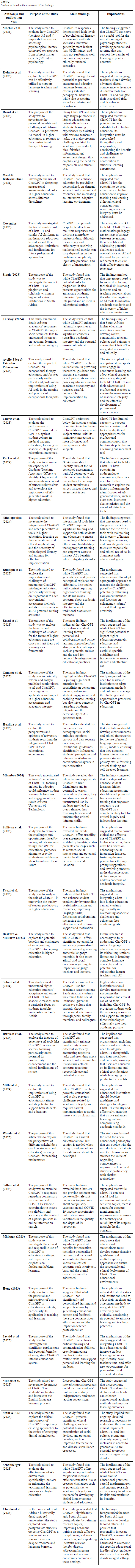 The findings section of this systematic review is based on a comprehensive analysis of 31 studies that were screened and assessed for eligibility. The studies were obtained from two databases and one search engine identified in the methodology section and evaluated based on strict inclusion and exclusion criteria. Table 2 shows the articles that were included and used in this study to discuss findings. Table 2 also depicts the implications of ChatGPT when utilised in teaching and learning.