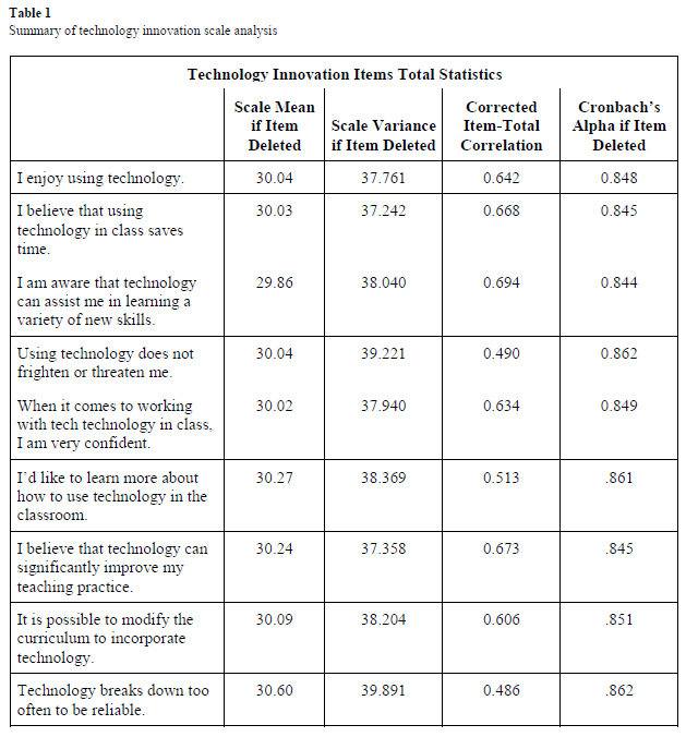 Table 1 presents the statistical analysis of students' perceptions of technology innovation. The scale, comprising nine items, evaluates attitudes and perceptions regarding various aspects of technology use in education.