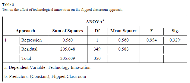 The ANOVA results indicate that technological innovation does not contribute significantly to learning outcomes in the flipped classroom approach. This unexpected finding suggests that, within the study's parameters, incorporating technology in the flipped classroom does not yield a statistically significant improvement in technology innovation.