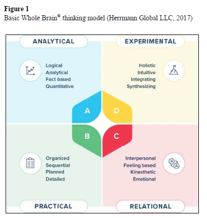 Whole Brain® thinking, developed by Ned Herrmann, is a cognitive process that acknowledges the diverse thinking preferences of individuals, as illustrated in Figure 1 (Herrmann, 1995). This approach categorises thinking into four quadrants-analytical, practical, relational, and experimental-and suggests that individuals have preferences for modes of thinking in each quadrant (Herrmann Global LLC, 2017).