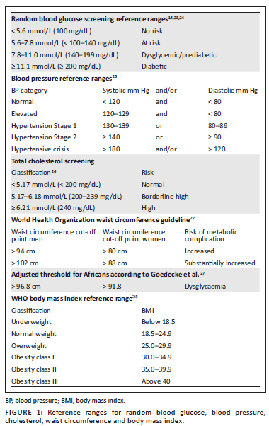 A microlife® A150 AFIB electronic blood pressure monitor with stroke risk detection was used to assess blood pressure.19 To ensure accuracy, participants were seated in a chair with back support, legs uncrossed and both feet flat on the floor for a minimum of 5 min before the reading was recorded.20 Blood pressure measurements were taken with the arm raised to the level of the heart, and both the systolic and diastolic readings were recorded. Random blood glucose and total cholesterol were assessed using the CardioChek Plus and Unistik Touch Safety Lancets.21 Weight, height and abdominal girth were measured using a microlife® diagnostic scale WS 80-N, stadiometer and measuring tape respectively. Abdominal girth was measured according to the WHO guidelines, at the midpoint between the lower margin of the last palpable rib and the top of the iliac crest, using a non-elastic tape.22 All equipment underwent calibration prior to the screening to ensure precision. Figure 1 outlines the reference ranges for RBG, blood pressure, cholesterol, waist circumference and body mass index (BMI) used in this study.