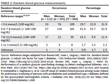 It was observed that the majority of the sample population (52.9%) had a RBG level of between 5.6 and 7.8 mmol/L, while 11.4% recorded levels between 7.8 and 11.0 mmol/L, and 2.3% (n = 8) had a reading equal to or exceeding 11.1 mmol/L. While the diagnostic criteria for DM require more stringent testing, there is growing evidence to support the use of RBG testing for large-scale screening, indicating the benefit of detecting undiagnosed DM and prediabetes.14,23 Ziemer et al. were able to demonstrate that by using the RBG on a representative sample resulted in higher sensitivity and specificity for detecting undiagnosed DM compared to a similar study using the glucose tolerance test.34 Additionally, RBG testing has been suggested as a cost-effective method for identifying individuals at risk of developing DM and limits the need for fasting, indicating its convenience and practicality for large-scale screening.23