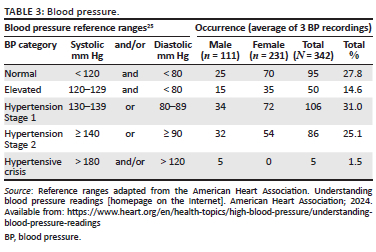 Each participant had three separate blood pressure measurements taken at different points during the screening process, allowing for a comprehensive assessment of the individual's blood pressure and ensuring accuracy by minimising the influence of momentary fluctuations. Table 3 summarises the measured blood pressures.