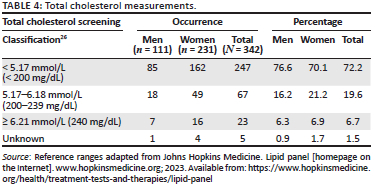 A random total cholesterol measurement was recorded for each participant. Table 4 summarises the total cholesterol measurements.