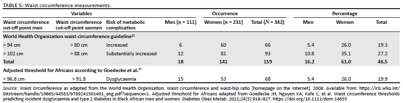 There is no consensus on the appropriate threshold for waist circumference in sub-Saharan Africa and the IDF recommends the use of Europid thresholds.3 Goedecke et al. proposed waist circumference as a predictor for dysglycaemia and DMT2 in African men and women; however, the optimal waist circumference threshold to predict dysglycaemia and DM in men was 96.8 cm for both, while for women, dysglycaemia was 91.8 cm and DM was 95.8 cm, which had lower sensitivity, but higher specificity than the IDF threshold of 80 cm.27 Previous African studies support these findings and suggest higher thresholds than the IDF guidelines for African men and women. These studies all agree that waist circumference thresholds should be region-specific and more prospective studies are needed to determine exactly what these thresholds are.53,54,55 When adjusting the waist circumference thresholds to those of Goedecke et al., 19.9% of the Otjomuise sample group may be at risk of dysglycaemia.