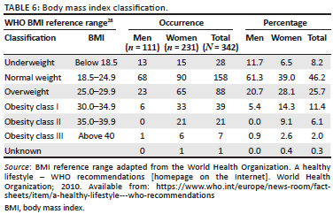 Each participant's height and weight measurements were recorded, enabling the calculation of their BMI. Table 6 indicates the participants calculated BMIs.
