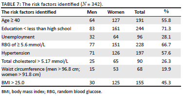 A further analysis of the above data sets allowed us to identify risk factors that are commonly linked to the development of diabetes. This revealed that 55.8% of participants were aged ≥ 40 years, 66.7% had a RBG ≥ 5.6 mmol/L, 57.6% were hypertensive, 26.3% had a total cholesterol ≥ 5.17 mmol/L, 19.9% had an abnormal waist circumference and 45.3% had a BMI > 25.0 Table 7 summarises these findings.